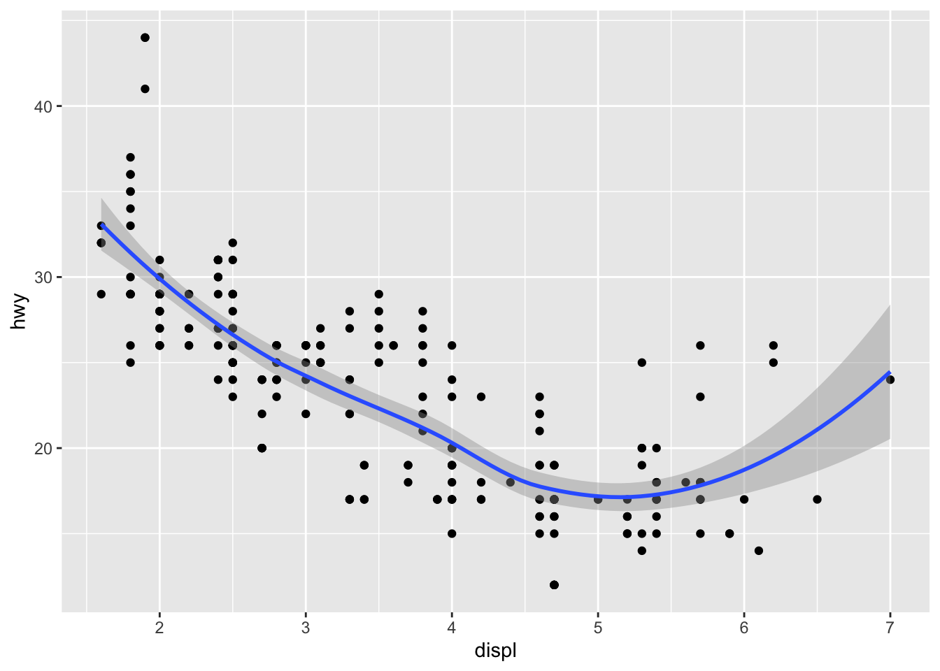 ---title: "Data Visualization with ggplot2"---## Learning ObjectivesBy the end of this chapter, you should be able to:- Create basic scatterplots using `ggplot2`- Map variables to aesthetics (color, size, shape)- Use different geoms (points, smooth lines, histograms)- Create facets to display subsets of data- Customize plots for clear communication------------------------------------------------------------------------## Introduction to Data VisualizationThis week we begin with **visualization first**, following *R for Data Science (Ch. 2)*.\`ggplot2` is part of the tidyverse and implements the **grammar of graphics**.\We will use the built-in `mpg` dataset for examples.------------------------------------------------------------------------## ggplot2 BasicsThe **template** for a ggplot is:``` rggplot(data =<DATA>) +<GEOM_FUNCTION>(mapping =aes(<MAPPINGS>))```### Example: Scatterplot of engine size vs. highway mpg```{r}library(tidyverse)ggplot(data = mpg) +geom_point(mapping =aes(x = displ, y = hwy))```------------------------------------------------------------------------### In-Class Exercise 11. Create a scatterplot of `cty` (city mpg) vs. `hwy` (highway mpg).\2. What relationship do you see?\3. Try swapping x and y—does it change the interpretation?------------------------------------------------------------------------### Aesthetic MappingsYou can map variables to visual properties: color, size, shape, alpha.### Example: Color by class```{r}ggplot(data = mpg) +geom_point(mapping =aes(x = displ, y = hwy, color = class))```------------------------------------------------------------------------### In-Class Exercise 2- Modify the plot to map `size` to `cyl` (number of cylinders).\- Map `shape` to `drv` (drive type).\- Try using both color and shape in one plot.------------------------------------------------------------------------## Adding GeomsThe `geom_point()` function creates a scatterplot, but there are many geoms.### Example: Add a smoothing line```{r}ggplot(data = mpg) +geom_point(mapping =aes(x = displ, y = hwy)) +geom_smooth(mapping =aes(x = displ, y = hwy))```------------------------------------------------------------------------### In-Class Exercise 3- Add a `geom_smooth()` line to your plot from Exercise 1.\- Try setting `se = FALSE` to remove the confidence band.\- Change the color of the line manually.------------------------------------------------------------------------## FacetsFacets split the data into subplots based on a variable.### Example: Facet by drive type```{r}ggplot(data = mpg) +geom_point(mapping =aes(x = displ, y = hwy)) +facet_wrap(~ drv)```------------------------------------------------------------------------### In-Class Exercise 4- Use `facet_wrap()` to facet the plot by `class`.\- Try `facet_grid(drv ~ cyl)`—what do you observe?------------------------------------------------------------------------## Customizing PlotsYou can add labels, titles, and themes to improve clarity.```{r}ggplot(data = mpg) +geom_point(mapping =aes(x = displ, y = hwy, color = class)) +labs(title ="Fuel Efficiency by Engine Size",x ="Engine Displacement (L)",y ="Highway MPG",color ="Car Class" ) +theme_minimal()```------------------------------------------------------------------------## In-Class ChallengeUsing the `mpg` dataset:1. Make a scatterplot of `displ` vs `hwy`.\2. Map a third variable to `color`.\3. Add a smooth line and facet by drive type.\4. Add labels and use a clean theme.------------------------------------------------------------------------## Homework PreviewFor **Homework**, you will:- Use the `mpg` dataset (or another dataset of your choice).\- Create **three plots**: 1. A scatterplot with at least one aesthetic mapping 2. A faceted plot showing subsets of data 3. A customized plot with titles, labels, and a theme- Render your `.qmd` to PDF and submit on Canvas.------------------------------------------------------------------------## Next StepsNext week, we begin **data transformation** using `dplyr` to manipulate data before plotting.
